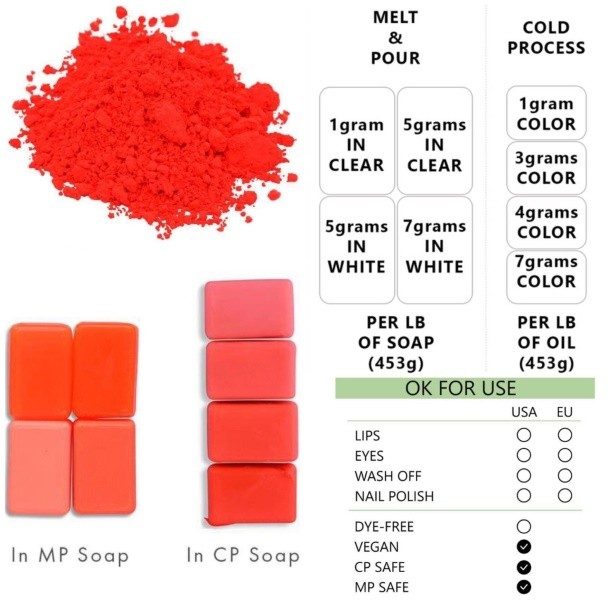 Bright red pigment for soap making and crafts.
